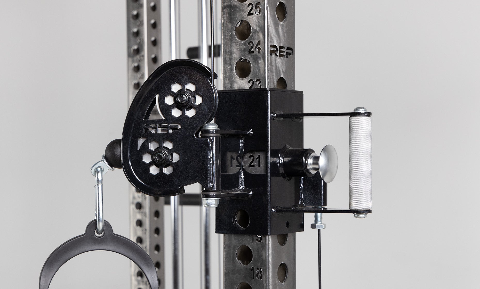 The Athena™ plate-loaded side-mount functional trainer is a low-profile cable attachment that integrates into the side of your PR-4000 or PR-5000 series power rack. Get the functionality of a functional trainer machine so you can build your upper body and get in accessory and isolation work, without needing space for a stand-alone unit. In addition, it provides a lower price point (and smaller footprint) than the Ares™ attachment, which includes a lat pulldown and low row. The Athena™ features a 2:1 pulley ratio, which means 20lbs feels like 10lbs. The weight horns have a loadable length of 10.6” each and a max weight capacity of 540lbs (feels like 270lbs). The Athena™ gives you the freedom to customize your rack’s functionality by choosing either a left, right, or dual-sided setup. The patent-pending Athena™ features a trolley that allows you to do cable work at any height on the upright and is lined with a special plastic to protect them.